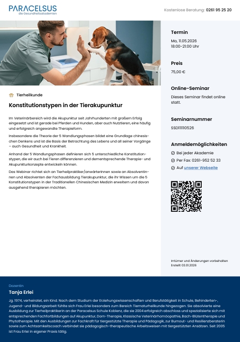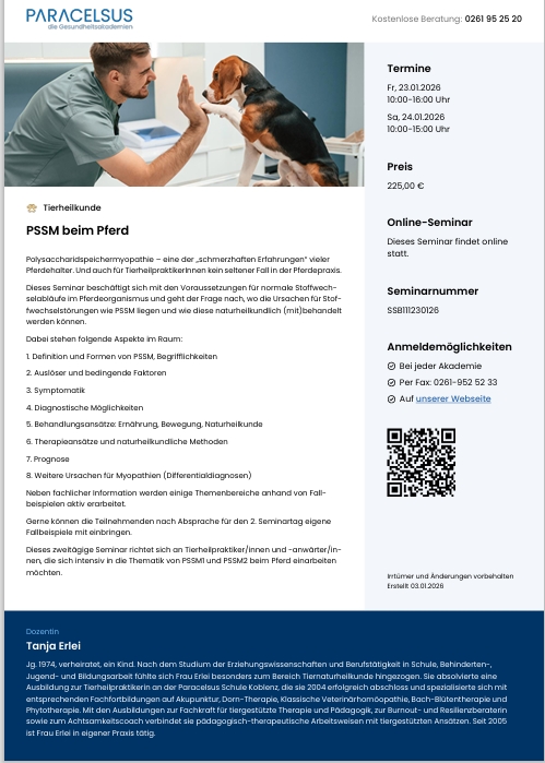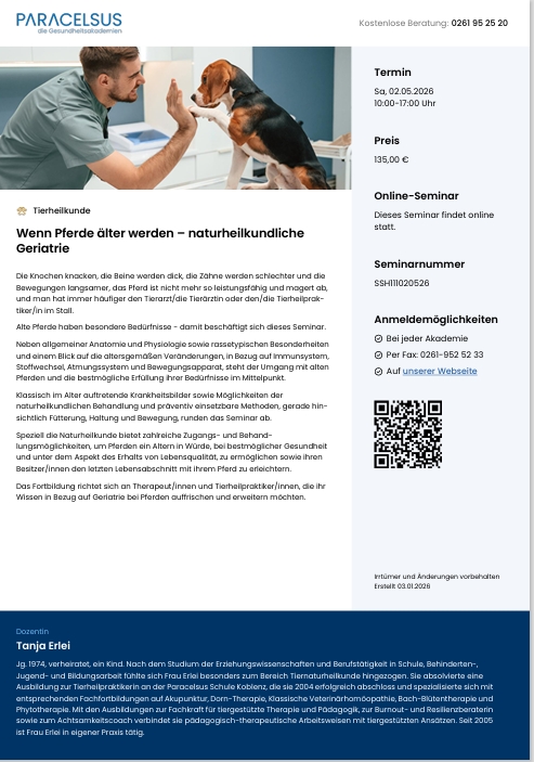 auch die Fachausbildungen Tierakupunktur, Phytotherapie in der Pferdepraxis, Gemmotherapie und Katzenverhaltenstherapie, Sonderseminare sowie Webinare zu unterschiedlichen Themen.